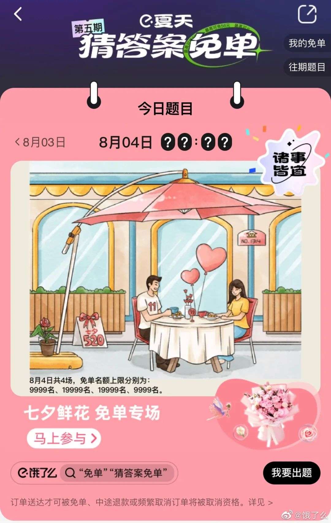 饿了么官方也于8月2日宣布,将开启“七夕鲜花免单专场”,三场免单时间直接告知用户,总计10000个免单名额,因此收获不少网友好评,“有人请我过七夕”确实值得高兴。