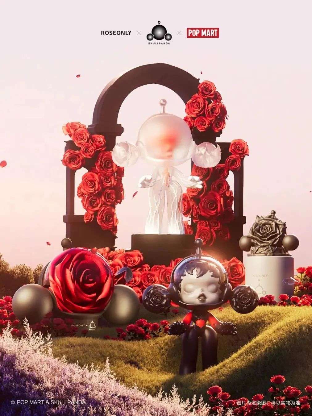 七夕前,泡泡玛特旗下IP SKULLPANDA携手ROSEONLY推出“爱·无畏”四款限定系列联名产品。其中,“纯爱玫瑰”高定永生花含SKULLPANDA特殊尺寸大娃一体,售价达29999元。目前该产品在全国的销售数量仅89体。