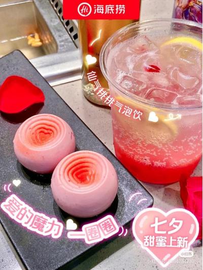 在小红书以及微博等社交平台上,也有不少网友打卡海底捞的七夕限定甜品“爱的魔力一圈圈”——白桃杨梅草莓树莓风味慕斯,售价13.14一份(两个),因其高颜值、高性价比收获一众网友的好评。