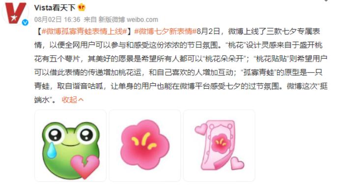 如8月2日,微博上线的“桃花朵朵开”“桃花贴贴”“孤寡青蛙”三款七夕专属表情,分别照顾到了情侣和单人人士的感受,也因此被网友戏称“挺端水”。