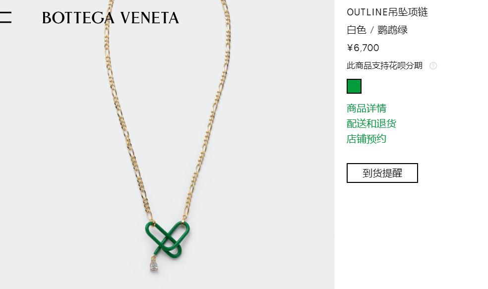 其中BV七夕限定的项链,吊坠神似两个回形针,在官网售价为6700元。据了解,这条吊坠项链材质是银925/合成立方氧化锆,颜色为白色/鹦鹉绿。