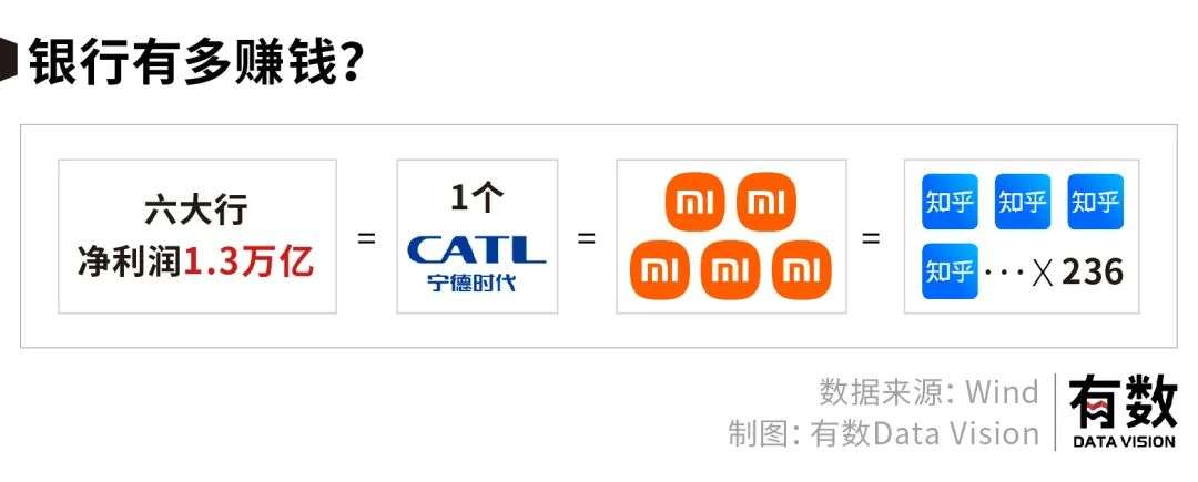 而如果以市值来衡量,六大银行的净利润可以买下1个宁德,或者5个小米,又或者236个知乎。王传福的比亚迪不吃不喝干三年差不多能达到这个数。