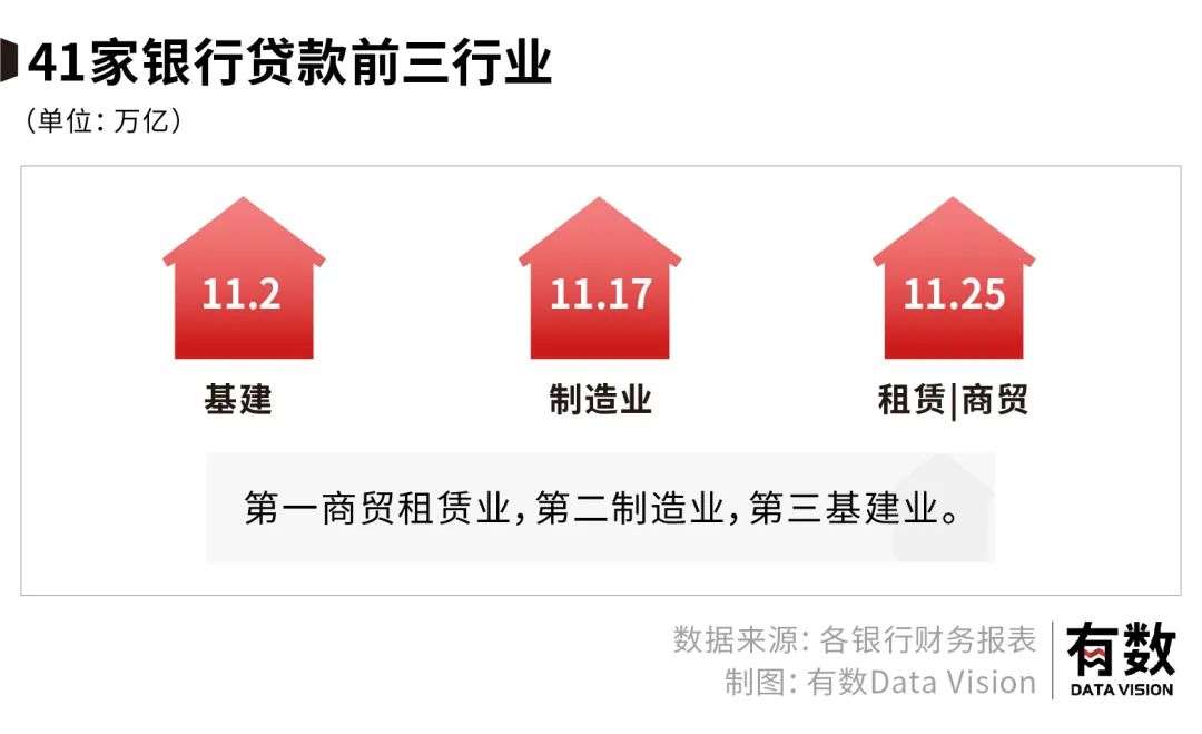 银行的贷款受政策指导影响较大。从行业来看,租赁商贸零售是银行重点投放贷款的领域,其次是制造业与基建,而地方银行更多偏向房地产。