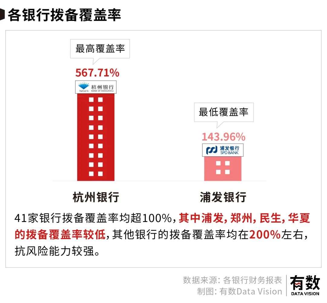 41家银行拨备覆盖率均超100%,其中浦发,郑州,民生,华夏的拨备覆盖率较低,其他银行的拨备覆盖率均在200%左右,抗风险能力较强。