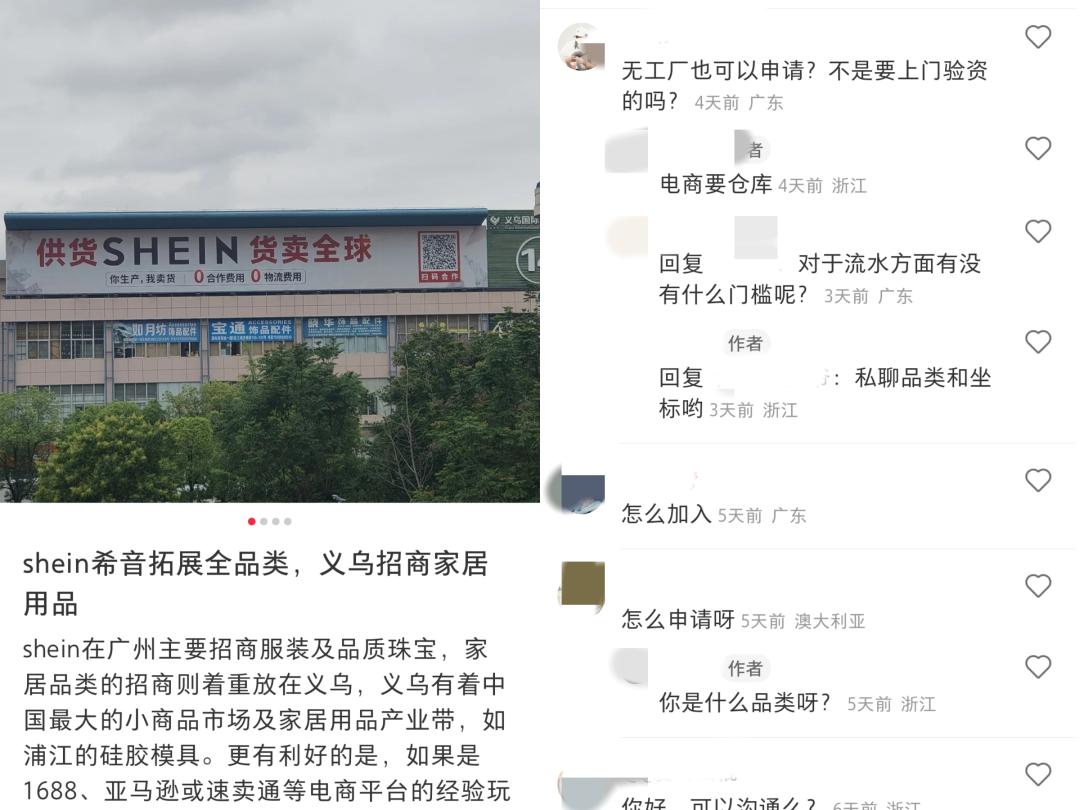 “一个细分品类就要几十几百个供应商,说实话广东那边找不到这么多供应商,或者说有些品类的供应商广东根本没有。” 一位SHEIN的买手(招商采购人员)告诉「电商在线」,SHEIN从去年开始就已经在义乌招商。在小红书、知乎等平台上,也能发现不少SHEIN的招商帖,寻求优质的义乌供应商合作。