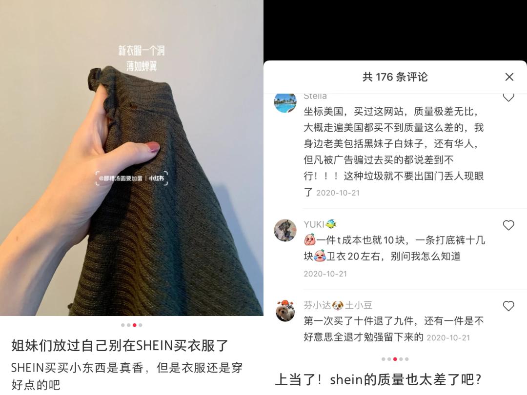 “上学的时候还会去买一些SHEIN的衣服,工作以后基本不会考虑,SHEIN的衣服质量都不是很好,不太适合工作人群。发绳衣架桌布什么的倒是买了一些,毕竟这种也不用在意质量。”在美国生活的琳琅表示,2021年毕业工作后,她就没有在SHEIN买过衣服。