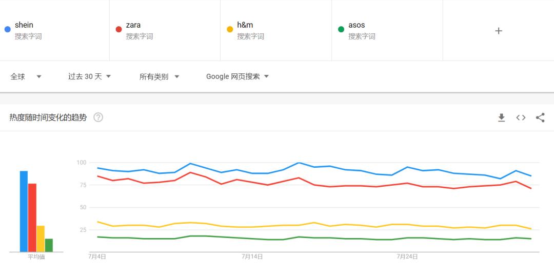 这个中文名希音的购物平台,拥有全球220个国家和地区的用户,并且在美国、巴西、澳大利亚等地取代了Zara:Google Trends数据显示,SHEIN在全球近30天的搜索量超过Zara,而App Store上,SHEIN的季度下载量超过亚马逊,成为了欧美年轻人心中最好的快时尚购物平台。