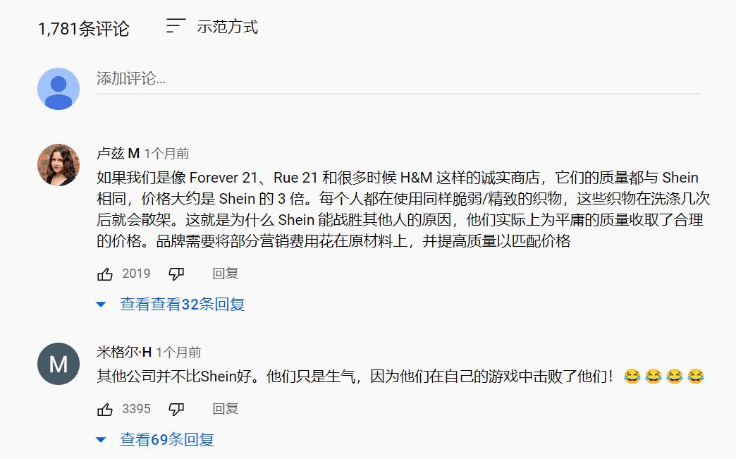 YouTube关于SHEIN的视频下,不少消费者都表示,他们深知SHEIN的质量没有多好,他们愿意购买最主要的原因是SHEIN为这个品质的衣服定下了合适的价格,而不是SHEIN有更好的时尚设计,或者独特的品牌魅力。