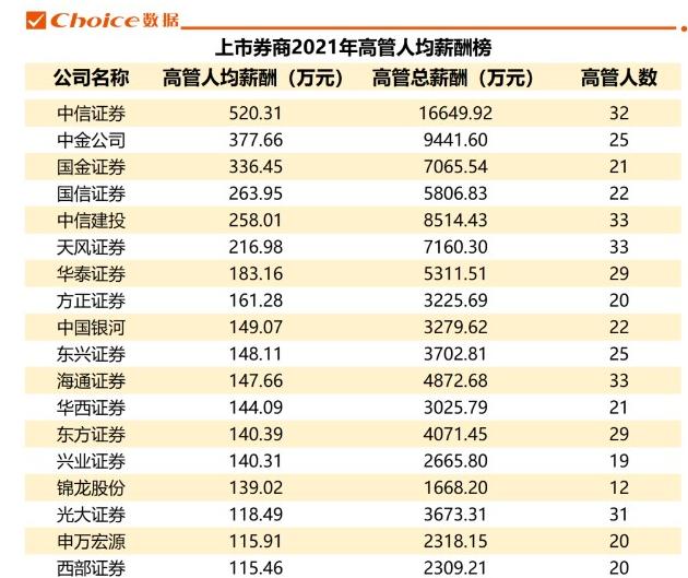 从上图就能看到,2021年中信证券高管人均薪酬520万,是人均薪酬的5.5倍。中金公司高管人均薪酬377万,是人均薪酬的3.25倍。国金证券高管人均薪酬336万,是人均薪酬的4倍。