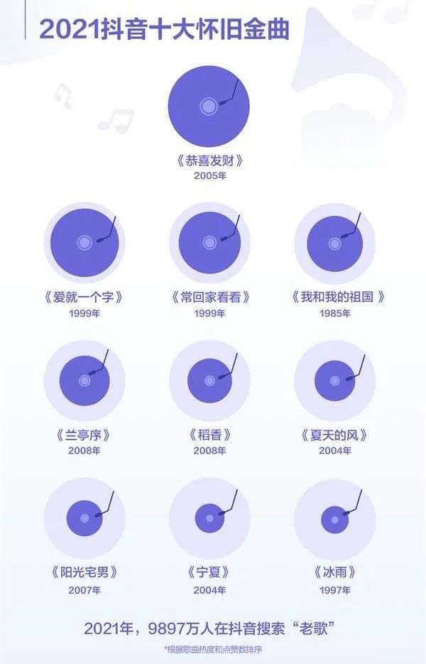同样的,在华语音乐市场也是如此。根据抖音在去年发布的《2021抖音数据报告》显示,仅过去一年,就有约1亿人在抖音搜索“老歌”,“十大怀旧金曲”更是横跨上世纪80年代至千禧年之后;而在主流音乐平台上,周杰伦、林俊杰、陈奕迅等多位颇有“怀旧感”的歌手,过往作品更是常年占据排行榜收听前列。