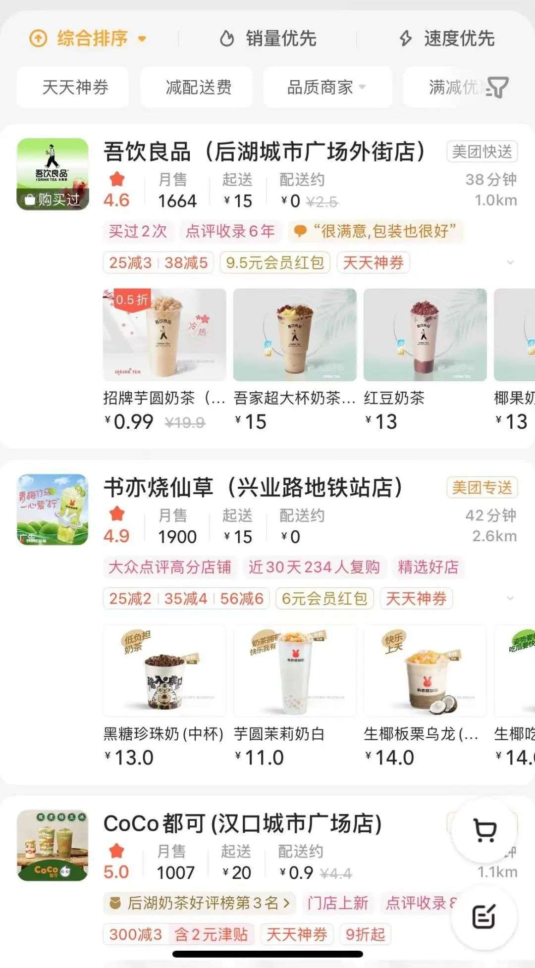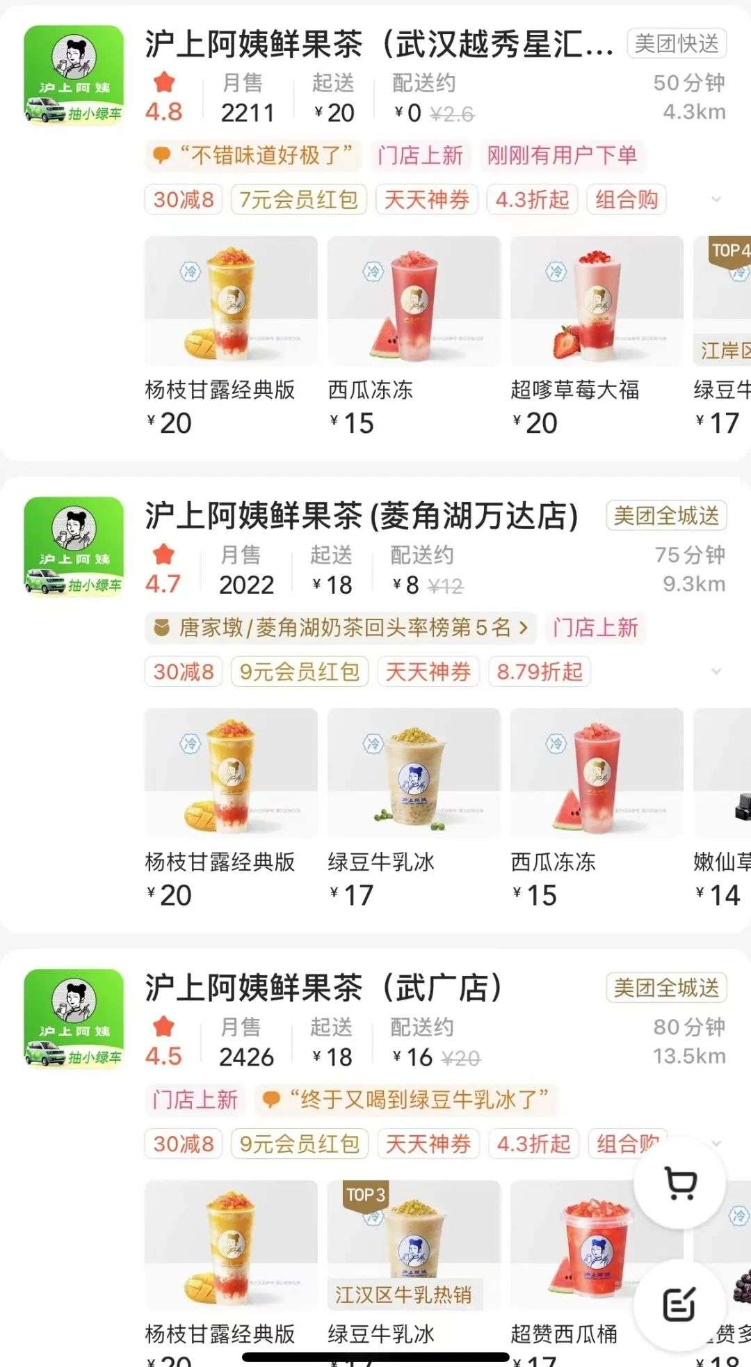 从美团外卖上可以显示出,沪上阿姨、益禾堂、CoCo都可、吾饮良品的图标不约而同地都变绿了。