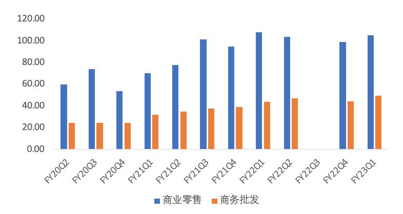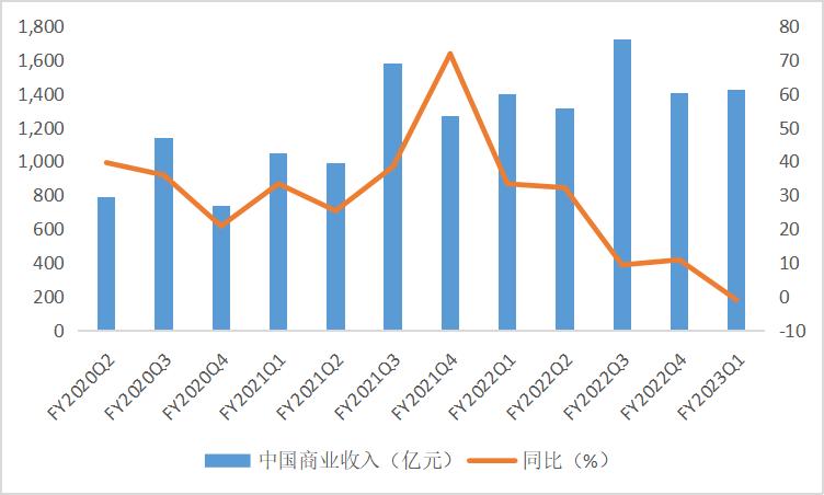 中国商业分部主要包括淘宝、天猫、淘特、淘菜菜、盒马、天猫超市、高鑫零售、天猫国际及阿里健康等中国零售商业业务,以及1688等批发业务。FY2023Q1,该分部实现收入1419.35亿元,同比下降1%,仍好于市场普遍预期的1409亿元。虽然收入在季度内小幅下滑,但4、5月份国内社会消费品零售总额分别同比下降11.1%、6.7%,阿里中国商业分部的表现在受到疫情的冲击下依然好于宏观数据。