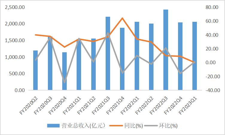 FY2023Q1(对应CY2022Q2),阿里巴巴营收2055.55亿元,高于彭博一致预期的2039.72亿元,同比基本持平,主要由于中国商业分部收入同比下降1%至1419.35亿元,云业务在本季度内超10%的强劲增长,部分对冲了中国商业分部收入同比下降的影响。