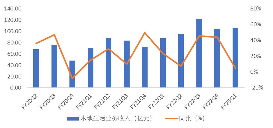 本季度,本地生活服务收入录得106.32亿元,同比增长5%。本地生活业务收入增速明显放缓,主要受报告期内疫情反复及防疫措施的影响,饿了么餐饮配送订单减少,导致本地生活服务整体订单同比减少5%,对冲了部分饿了么非餐订单和高德订单的增长。
