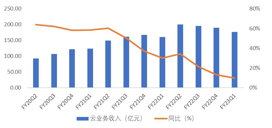 本季度,阿里云业务收入录得176.85亿元,同比增长10%。云业务收入增速放缓的原因,一方面在于经济活动放缓导致客户需求疲软,部分客户降低了数字化改造意愿,减少了云计算的投入预算;另一方面,受一线城市疫情影响,混合云交付进度受阻。