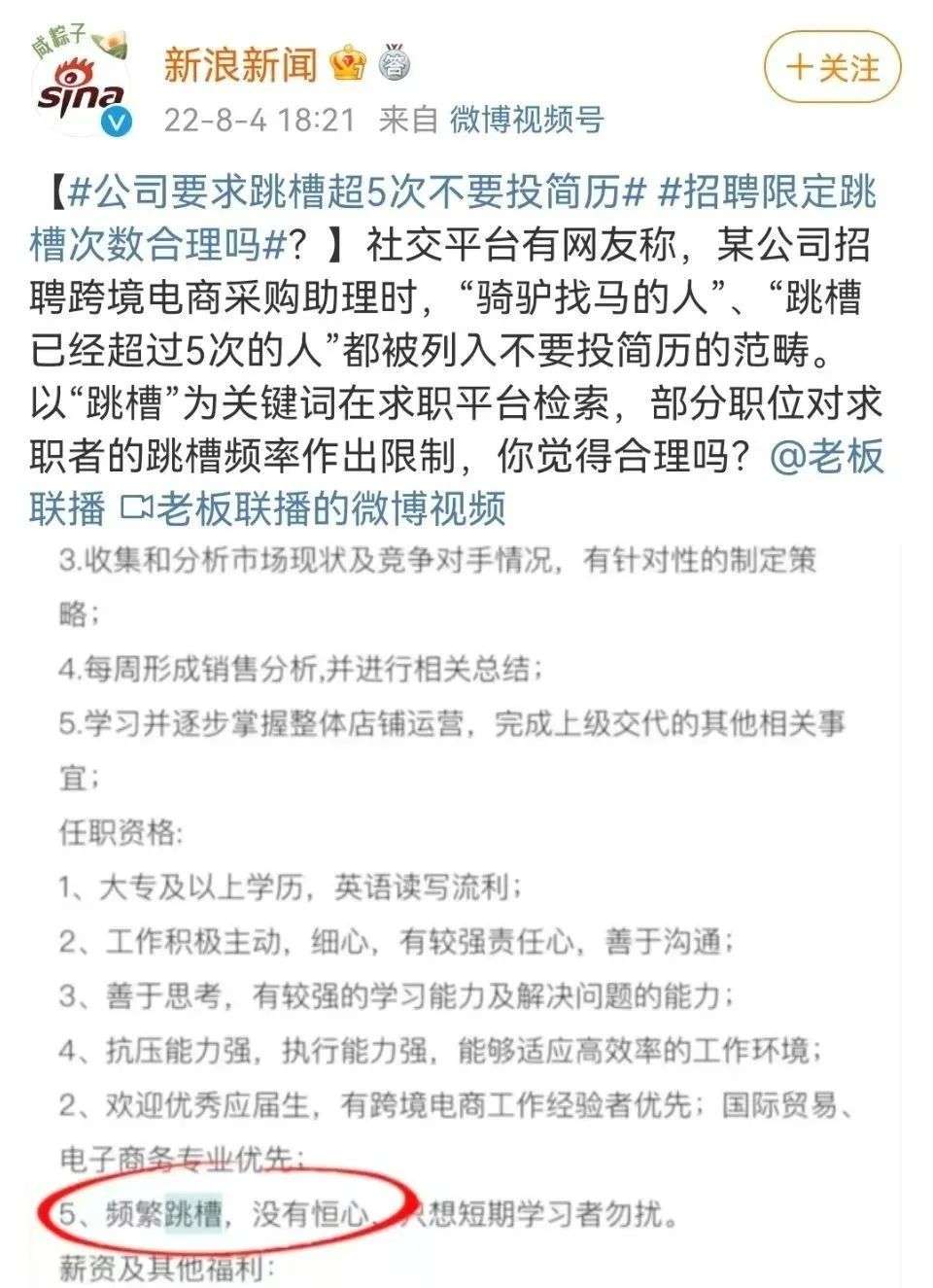 这几天,一家跨境电商招聘采购助理,里面有一条要求把自己推上了热搜——“骑驴找马的人”、“跳槽已经超过5次的人”不要投。