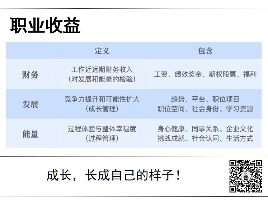 从生涯来看,职业收益不仅仅是“财务”,还包括“发展”和“能量”。