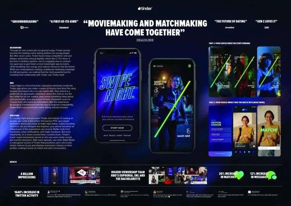 老牌约会软件Tinder试图让自己变得更具发现性和互动性,2019年推出互动冒险游戏“Swipe night”让用户第一视角感受世界末日情节,可以左滑右滑来选择故事走向,比如“你会救狗狗还是救人?” 同时选择相同的用户进行匹配,这一功能起到了初审三观的作用,并为用户聊天破冰。去年还推出了“发现”板块,用户可以参加像“Swipe Night”这样的活动,还能以兴趣话题寻找并与其他用户聊天,无需先进行匹配。