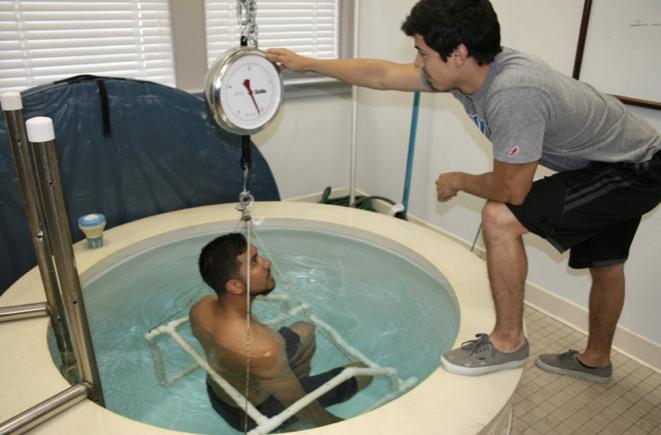 「水称重法」要求被测者全程浸没在水中,似阿基米德在浴缸测量真金密度一般,测量体成分:人体的肌肉和体液密度较大,在水中会向下沉,而脂肪密度较小,在水中会上浮。