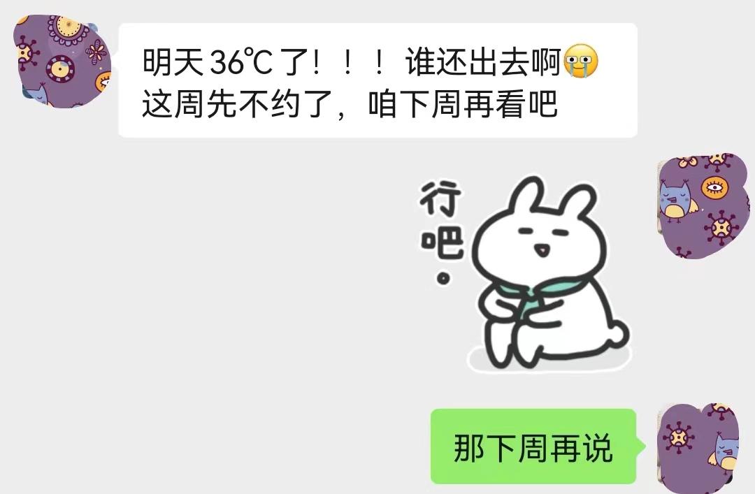 于是,我们两个的微信聊天界面,就变成了:“明天34/35/36/37℃了,这周先不约了,我们下周再看。”