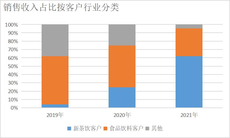 数据显示,田野股份来自食品饮料客户的销售收入占比已经从2019年的57.66%降至2021年的33.49%,来自新茶饮客户的销售收入占比则从2019年的4.2%上升到61.82%。