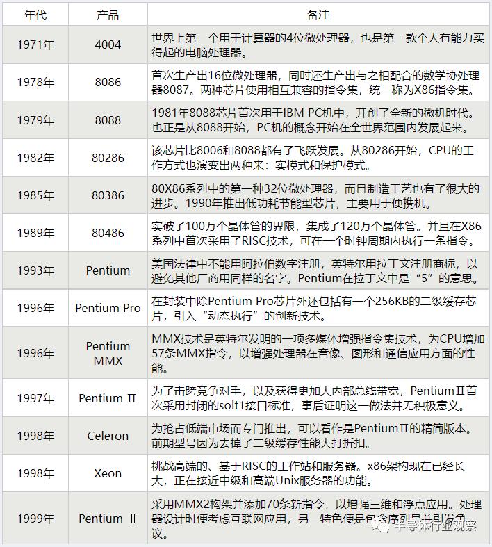 在1985年做出业务重心转移的决策后,英特尔接连推出80386、80486、Pentium(奔腾)等一系列经典处理器,其中80386是首款32位微处理器,奔腾处理器则是90年代最重要的技术之一。在与微软的联合下,英特尔终结了前王者IBM的垄断地位,成为PC世界新国王,至今PC行业中还无人能打破Windows加Intel的Wintel模式。
