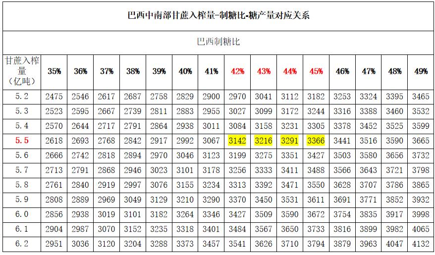 制糖比稳定在42%~45%之间的水平,机构对于巴西中南部甘蔗入榨总量的预估均值约为5.5亿吨。