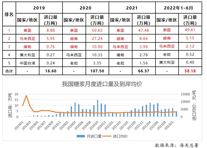 糖浆三项(税则号17029011、17029012、17029090)6月合计进口量为11.8万吨,同比增加5.58万吨,增幅89.57%;2022年1-6月糖浆三项共累计进口58.18万吨,同比增加34.97万吨,增幅150.71%,进口到岸均价约3121元/吨。