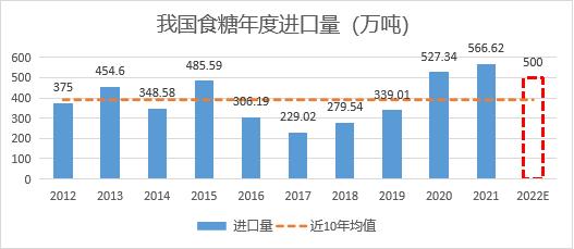2021年,我国累计进口食糖566.54万吨,创历史新高。2022年,即使食糖进口持续深度负利润,但进口糖数量并没有出现明显回落。2022年1-6月我国食糖进口176.35万吨,同比减少26.55万吨,降幅13.09%。预计2022年全年我国食糖进口量仍能达到500万吨。