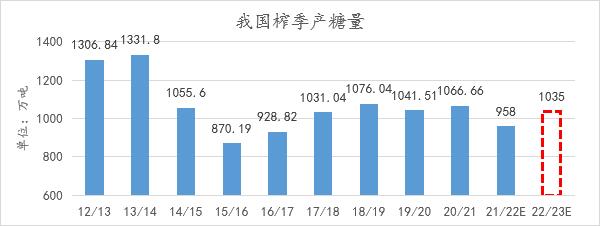 预计2022/23榨季我国产糖量预计有所回升。农业农村部预测2022/23榨季中国糖料种植面积为2043万亩,比上年度增加69万亩,预计食糖产量回升至1035万吨。(新疆/内蒙提高甜菜收购价;广西“清桉还蔗”、“退蕉还蔗”)