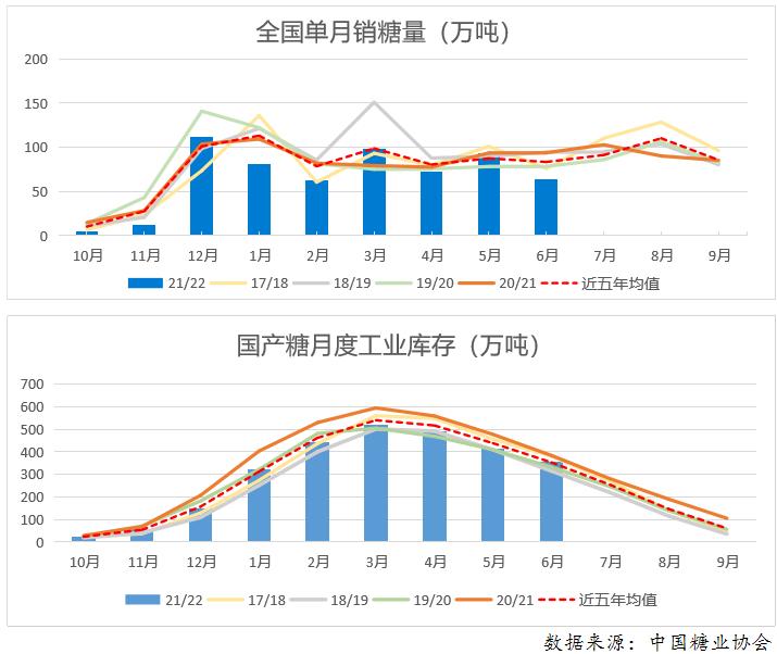 2021/22榨季截至6月末,全国累计销糖601万吨,同比下降82.21万吨,降幅12.03%。其中甘蔗糖销售533万吨,同比下降23.39万吨,降幅4.2%;甜菜糖销售68万吨,同比下降58.82万吨,降幅46.38%。