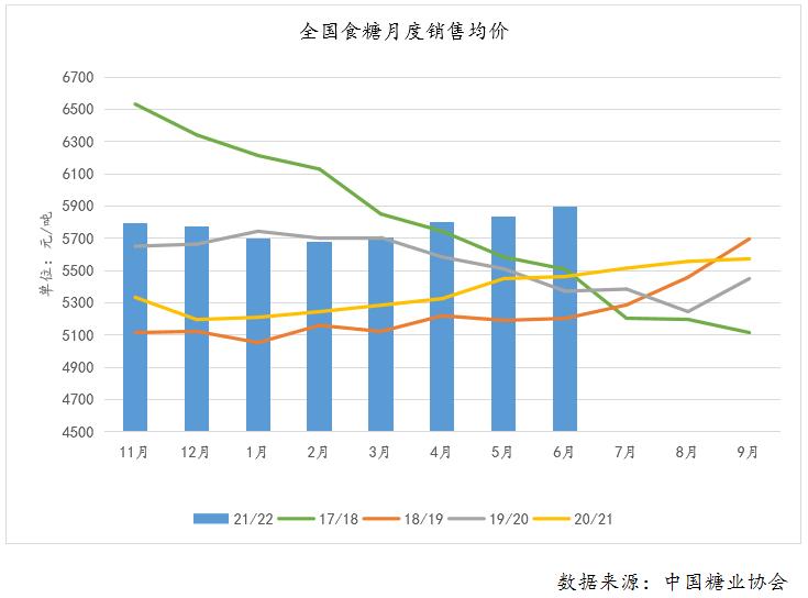 全国食糖2021/22榨季累计销售均价稳定在5700元之上,甚至一度逼近6000元/吨,糖企盈利增加。