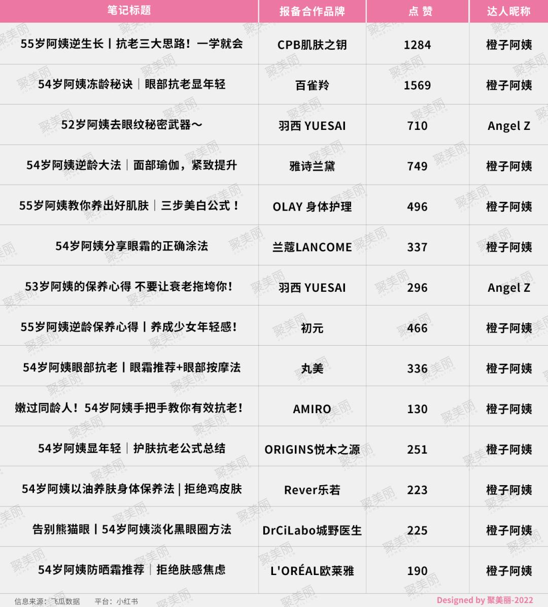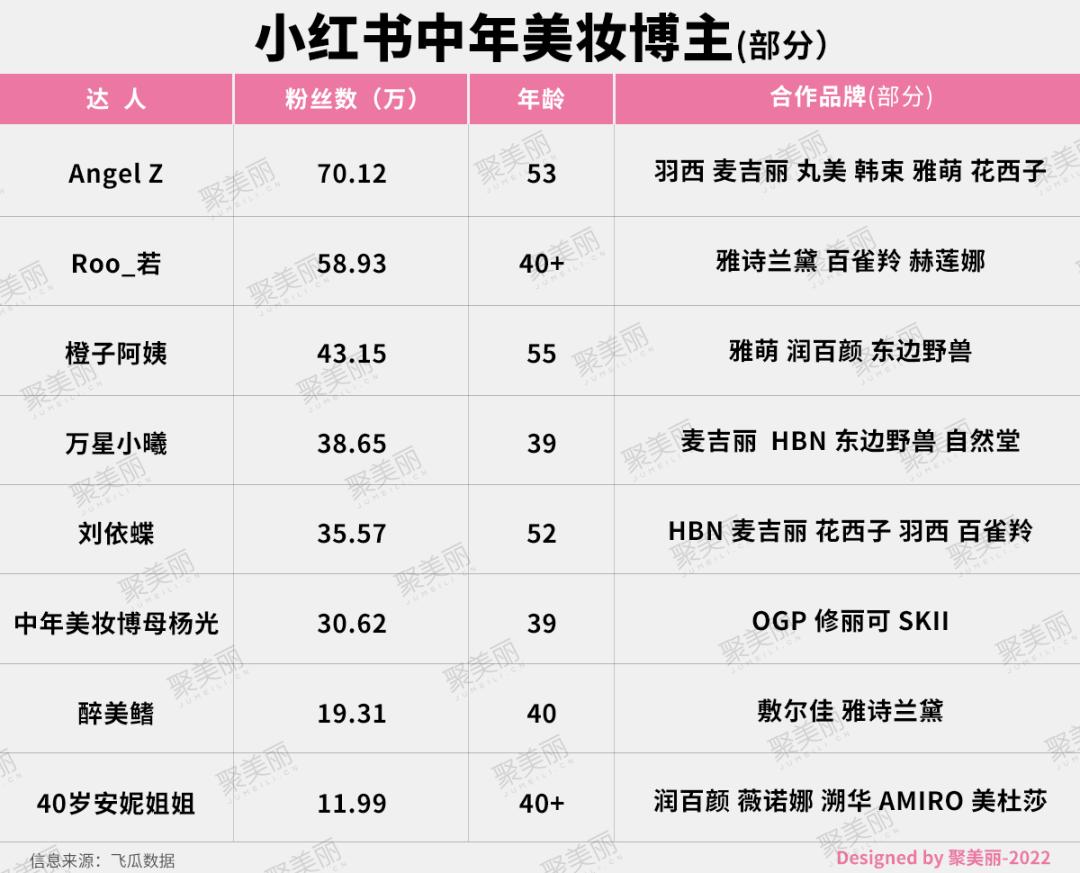 据不完全统计,小红书平台上这些中年美妆博主的合作品牌,主要涵盖国内绝大部分拥有“抗衰”线的品牌,譬如:羽西、麦吉丽、丸美、润百颜等知名美妆品牌。