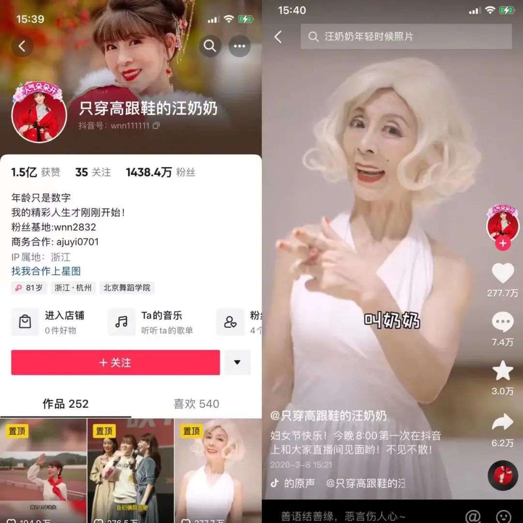 “只穿高跟鞋的汪奶奶”账号中的网红奶奶汪碧云,年近8旬依旧容光焕发,几乎每条视频里都穿着高跟鞋和修身长裙,喜欢称呼粉丝为“小闺蜜”,并帮她们解决各路情感问题,教会她们“独立自信爱自己”等。