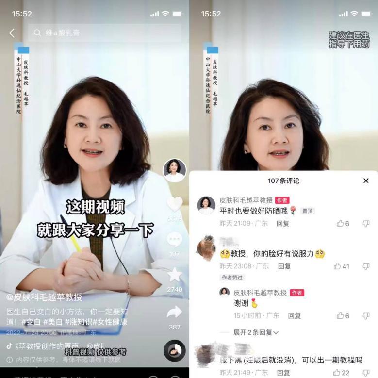 “正面案例是譬如‘皮肤科毛越萍教授’这个账号,是专业知识+冻龄形象完美结合的代表之一,粉丝粘性是很高的。如果能商业变现,应该有挺多抗衰品牌想与她这种类型的博主合作。”