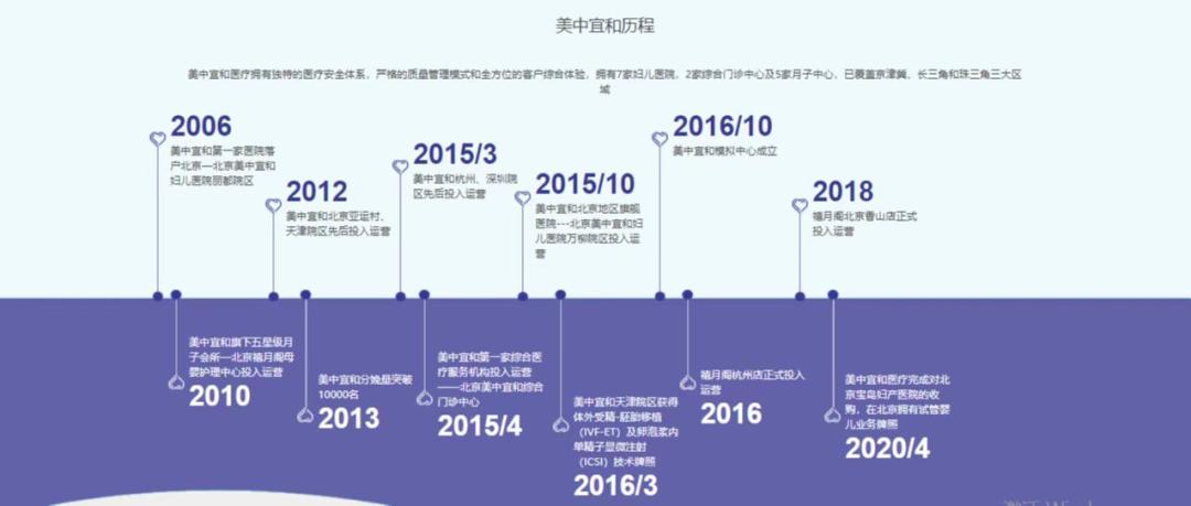 旗下业务则包含月子会所禧月阁、综合医疗服务机构美中宜和综合门诊、胚胎移植牌照。因在2020年收购北京宝岛妇产医院,还拿到了试管婴儿牌照。
