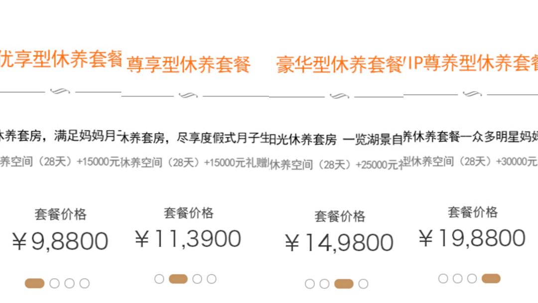 禧月阁官网展示的月子服务信息显示,按照优享、豪华、VIP尊养等不同类型以及月子休养时长的不同,相关套餐价格在9.8万至19.8万元不等。此前,其相关负责人也曾透露,该机构营收很大一部分来自产科,而产科客单价约为7万元,在行业里属于高价位。