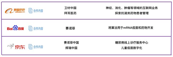 在这场找朋友的游戏里,阿里找到了卫材和拜尔;百度找到了赛诺菲;京东找到了辉瑞和武田制药。