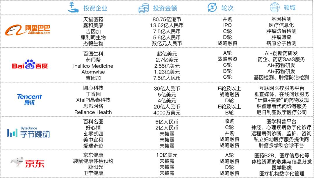 自2020年以来五家互联网大厂金额最大的几笔医疗领域投资,同时挑选它们最具有代表性的合作动作,来看一看什么项目是大厂医疗“基本款”,什么又是“搭配款”。