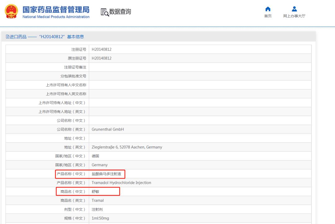 另外根据国家药监局药品查询平台显示,“舒敏”还是注册药品盐酸曲马注射液的商品名。