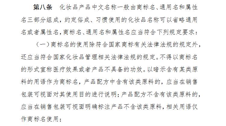 据悉,《化妆品标签管理办法》已明确规定,化妆品产品中的商标名、通用名和属性名不得以商标名的形式宣称医疗效果或者产品不具备的功效。此外,化妆品名称还应符合“以暗示含有某类原料的用语作为商标名,产品配方中含有该类原料的,应当在销售包装可视面对其使用目的进行说明;产品配方不含有该类原料的,应当在销售包装可视面明确标注产品不含该类原料,相关用语仅作商标名使用”等规定。