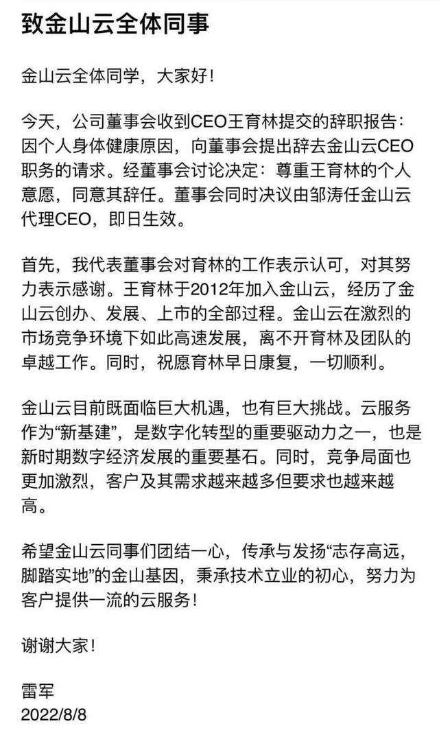 最新的例子是金山云。8月8日晚,兼职金山云董事长的雷军对外发布了一封《致金山云全体同事》的公开信,信中宣布在2012年加入金山云担任CEO一职的王育林,因个人身体健康原因递交辞职报告,金山云副董事长邹涛将接替王育林,出任代理CEO。