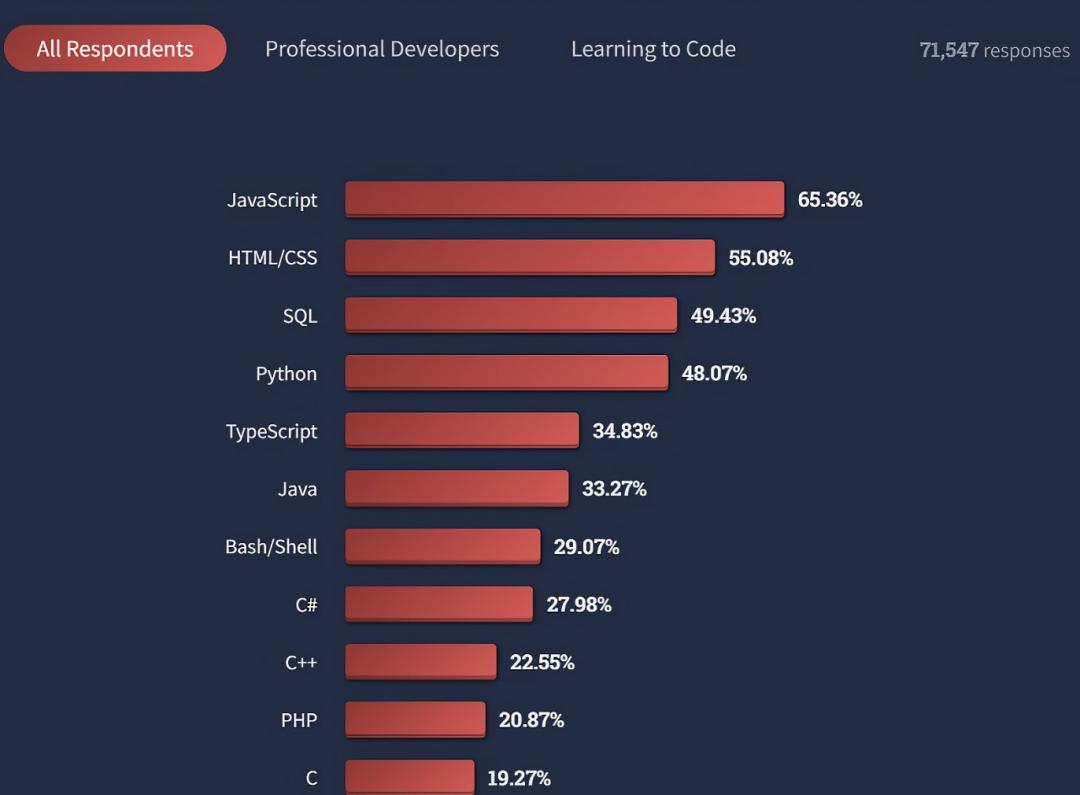同时,据多项调查报告显示,JavaScript 已霸榜多年。其中,根据今年早些时候的 Stack Overflow 发布的《2022 Developer Survey》报告显示,2022 年是 JavaScript 连续第十年成为最常用的编程语言。超过 65% 的开发人员使用 JavaScript,远远领先于排名第二占比 48% 的 Python(忽略 HTML、CSS 和 SQL,它们不是通用语言)。对于初学习编码的人员而言,他们最常用的语言是 HTML / CSS、JavaScript 和 Python,而专业开发者则是 JavaScript、HTML/CSS 和 SQL。