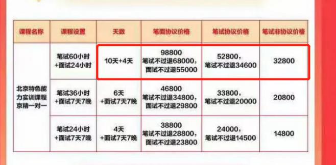 我们还拿这个协议班算一笔账,报名14天的协议班,如果笔试面试都通过,中公可以赚到98800;就算这个学员连笔试也没过,也能赚到30800。