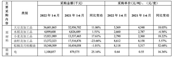 公司的产品均是以农副产品作为主要的原材料,并通过不同的工艺加工生产而来。从成本构成来看,大豆等直接材料在总成本中的占比均达到了近九成,因此,大豆的商品价格带动了公司采购成本大幅上升,其中,采购金额最大的大豆及加工品的成本上升了11.06%,小麦加工品的采购成本上升了17.61%。