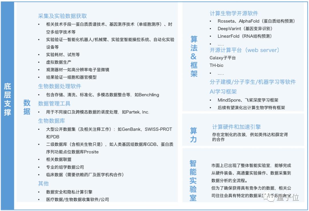在底层支撑中,生物数据及算法框架成为两大关键。