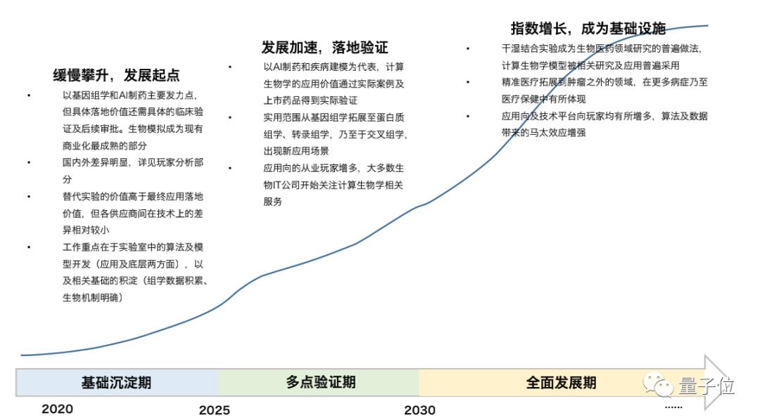 以最终落地应用和商业化为核心导向,我们将计算生物学的发展阶段分为三部分: