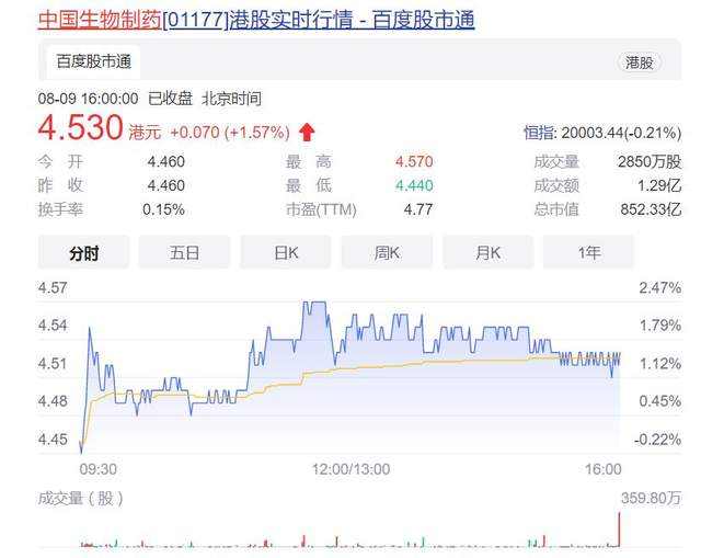 最新财报显示,2021年中国生物制药实现营收268.61亿元,同比增长13.6%,实现归母净利润146.08亿元,同比增长427.2%,截至8月9日收盘,中国生物制药报4.530港元/股,总市值超过852亿港元。