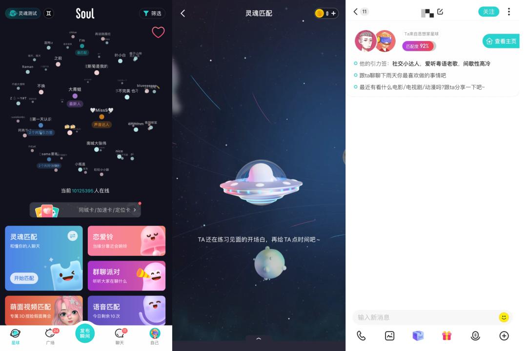 那些玩兴趣、灵魂、元宇宙概念的社交产品也一样。比如Soul,答完测试题就可以开始寻找灵魂好友,甚至都不需要设置真实头像。在探探、积目、她说等软件,还得用户双方看对眼才能成功聊天,Soul则是百分百“包匹配”。