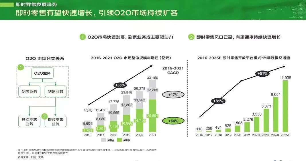 相关机构预估,即时零售正面向着万亿的市场前景。招商证券认为,2025年,即时零售的规模有望达到10964亿元。未来五年,年度复合增长率将达到36%。艾瑞咨询认为,2021年我国零售O2O渗透率约1.6%,预计2025年提升至7.8%,2025年即时零售规模约为1.2万亿元。